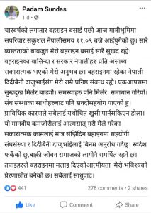 उहाँको स्टाटसमा भनिएको छ , ” चारबर्षको लगातार बहराइन बसाई पछी आज मात्रीभूमिमा सपरिवार सकुशल नेपालीसमय ११.०९ बजे आईपुगेको छु। सारै ब्यस्तताको बावजुत मेरो बहराइन बसाई सारै सुखद रह्ये। बहराइनका बासिन्दा र सरकार नेपालीहरु प्रति असाध्य सकारात्मक भएको मेरो अनुभव छ। बहराइनमा रहेका नेपाली दिदीबैनी दाजुभाईसंग मेरो राम्रै घनिष्ठ संबन्ध रह्ये। एकआपसमा सुखदूख मिलेर बाड्यौ। समस्याहरु पनि मिलेर समाधान गरियो। संघ संस्थाका साथीहरुबाट पनि सक्दोसहयोग पाएको हु। प्राबिधिक कारणले सबैलाई यथोचित खुसी पार्नसकिएन होला। यो मानवीय कमजोरीलाई आत्मसात् गरी मैले गरेका सकारात्मक कामलाई मात्र संझिदिन बहाइनमा सहयोगी संघसंस्था र दिदीबैनी दाजुभांईलाई बिनम्र अनुरोध गर्दछु। स्वदेश फर्केको छु,बाक़ी जीवन समाजको लागीनै समर्पित रहने छ।तपाइहरुले बहराइनमा मलाइ दिएकोआत्मीयता मेरो भबिश्यको प्रेरणास्रोत बनेको छ। सबैलाई साधुवाद। ”