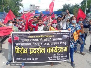 नेपाल कम्युनिष्ट पार्टी विप्लव समूह निकट युवा संगठन उपत्यका विशेष ब्यूरोले एमसीसी खारेजी , आर्थिक अनियमितता , बेरुजु र भ्रष्टाचार विरुद्ध बिरोध प्रदर्शन गरेको छ ।