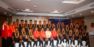 काठमाडौं । फिफा विश्वकप २०२६ र एशियन कप २०२७ को संयुक्त छनोट अन्तर्गत दोश्रो चरणमा युएई र यमनबिरुद्धको खेल खेल्ने नेपाली राष्ट्रिय फुटबल टोलीलाई बिदाइ गरिएको छ आइतबार काठमाडौंमा एक कार्यक्रमबीच टोलीको बिदाइ गरिएको हो । खेलाडीलाई अखिल नेपाल फुटबल संघ (एन्फा) मा अध्यक्ष पंकजविक्रम नेम्वाङ । महासचिव किरण राई, सिईओ ईन्द्रमान तुलाधर लगायतले आईतबार टोलीलाई बिदाइ गरे ।