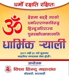 देशमा बढ्दै गएको धर्मान्तरणकाविरुद्ध हिन्दू अधिराज्य पुनर्थापनाको माग गर्दै विश्व हिन्दु महासंघद्वारा २०८१ भदौ २८ गते काठमाडौंमा आयोजना गरिने धार्मिक र्‍याली गर्न लागिएको हो ।
