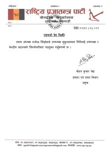 काठमाडौं, २ साउन । राष्ट्रिय प्रजातन्त्र पार्टीको आन्तरिक बिबाद चरम हुदैँ गएको छ ।