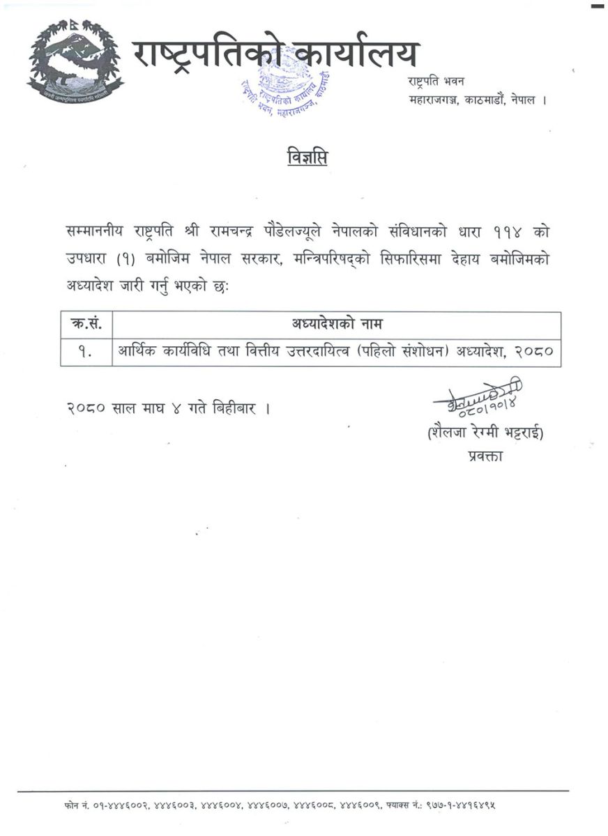 आर्थिक कार्यविधि तथा वित्तीय उत्तरदायित्व सम्बन्धि अध्यादेश जारी