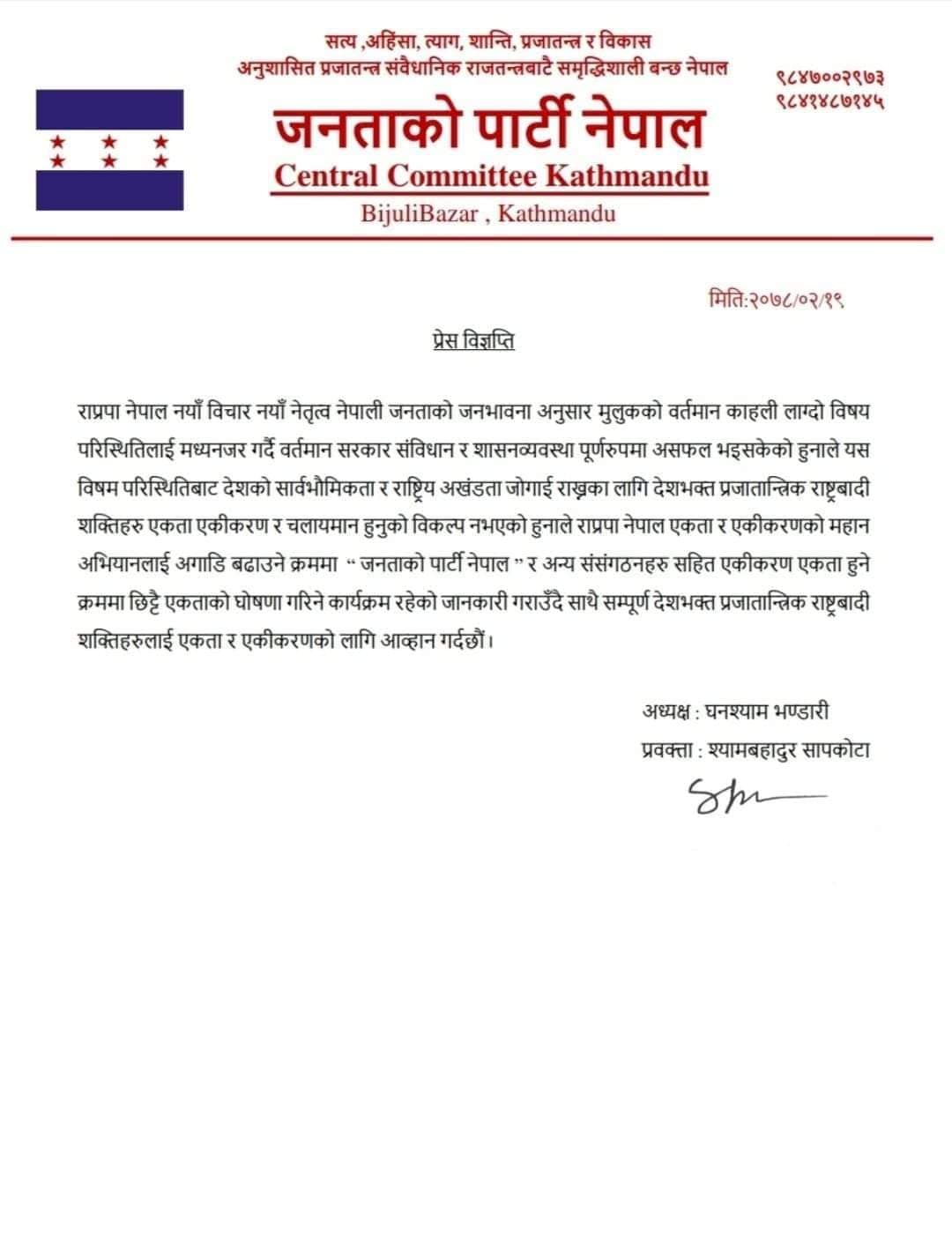 राप्रपा नेपाल र जनताको पार्टी नेपालबीच एकता हुने